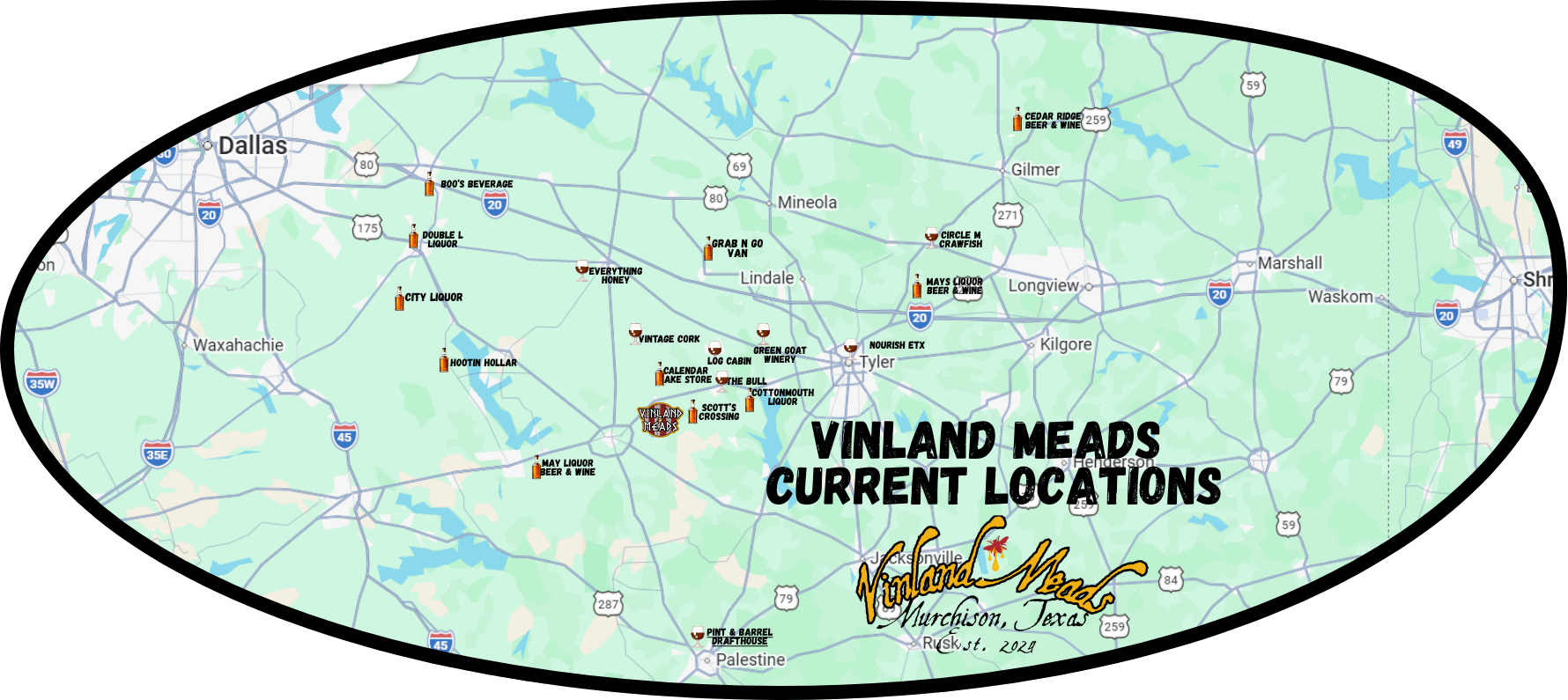 A Main Stay in Murchison Texas, Scott’s Crossing has the old time General Store atmosphere. You can get one of the best meals in the area, gas, drinks, and Vinland Meads. Currently stocking our Heritage - Traditional Mead, Harvest - Blackberry Mead, and Vixon - Cinnamon Mead. Vinland Meads is Proud to be in our Local Venues.